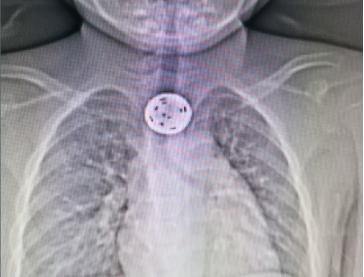 9月20日,一位父亲带着其5岁的娃来到了中山一院惠亚医院耳鼻咽喉科门诊就诊。家长向医生描述说,小孩一直按着喉咙说有点痛,但是具体哪里不舒服又说不出来,已经去了多家医院及诊所,都找不出原因,不知道是不是卡鱼刺了。经我院医生查体,未发现咽部有异物,联想到此前曾接诊过的类似病例,经患儿家属同意后行食管CT检查进一步明确病因。CT结果提示,在食管胸段约胸1、2椎体水平竟然发现了盘状异物残留。