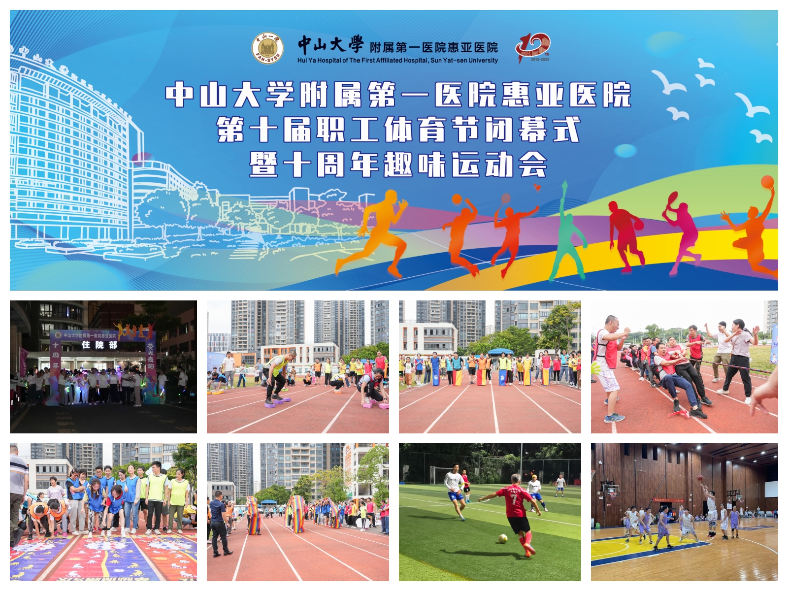 10月期间,我院举办了为期一个月的第十届职工体育节暨十周年趣味运动会活动。活动共设四大项赛事,分别是荧光夜跑、院内篮球赛、足球友谊赛以及趣味运动会,近500人次职工参加各项赛事。