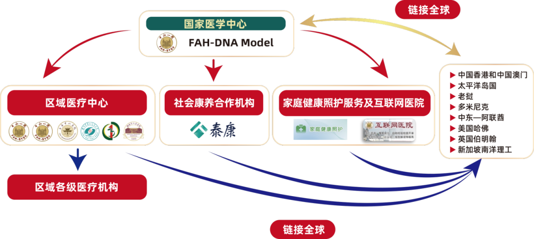 “FAH-DNA模式”是中山一院创新提出的新型健康服务网络模式,以中山一院为核心,联动哈佛、伯克利、伯明翰、南洋理工等国际一流医疗中心资源,以医生(Doctor)、护士(Nurse)和以人工智能(AI)为代表的先进技术为载体,通过带动、引领各地区域医疗中心、社会医疗机构,建立家庭医疗照护体系(Home Hospital Care)及互联网医院,逐层级、逐梯次输出理念、模式、制度,输出人才、技术、文化,将优质医疗服务“零距离”送达每一个社区、每一个家庭、每一个患者,提升百姓就医的可及性、公平性、同质性,让国家医学中心引领、示范、辐射核心作用显著提升。