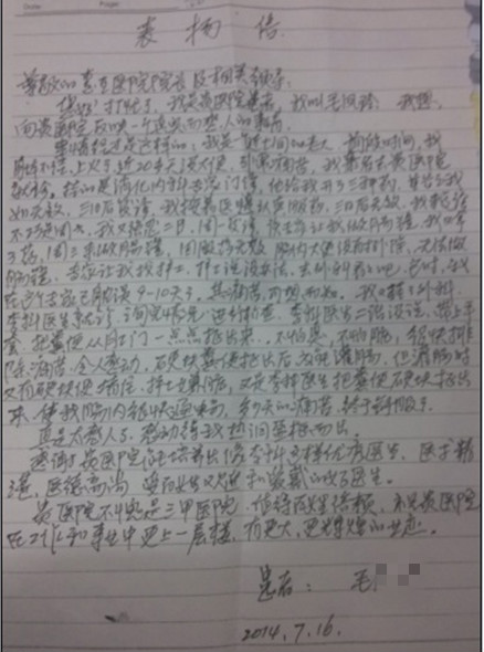 在信中,老人这样写道:“感谢贵医院能培养出像李科这样优秀医生,医术精湛、医德高尚,受百姓欢迎和爱戴的好医生。贵医院不愧是三甲医院,值得百姓信赖。”